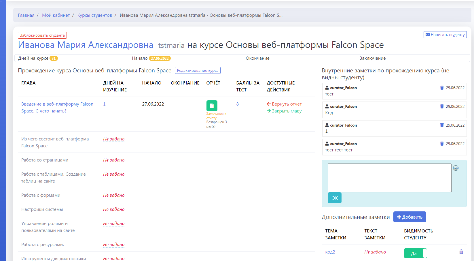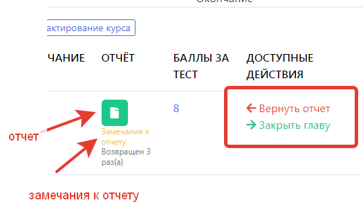 Если студент сдает отчет, он появляется в этой таблице. Вернуть отчет на доработку можно сразу. Принять его можно, если студент уже успешно прошел тестирование по главе (или его не предусмотрено). Принимая отчет, Вы одновременно закрываете главу.