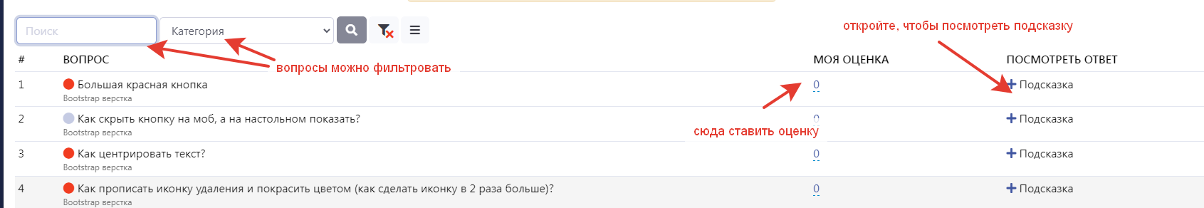 Самооценка нужна в первую очередь самому обучающемуся. Так Вы можете найти темы для дополнительно изучения, слабые места в своих знаниях и просто интересные моменты по курсу.