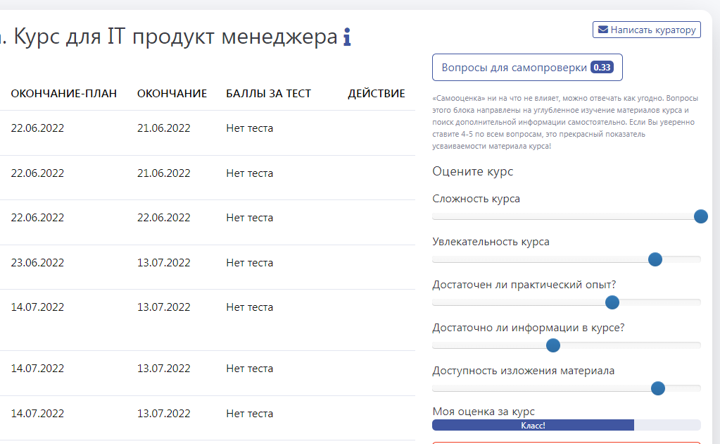 Закончив курс, Вы можете оставить куратору обратную связь, оценив его работу. Форма для оценки появится на странице курса.