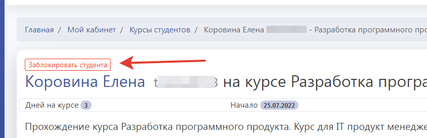 Разблокировать тоже возможно. При операциях блокировки/разблокировки обязательно надо указывать причины, это поможет Вам и менеджеру при вопросах блокированного студента. Можете прикладывать ссылки на скриншоты (например, Яндекс.скриншоты) с нарушениями.