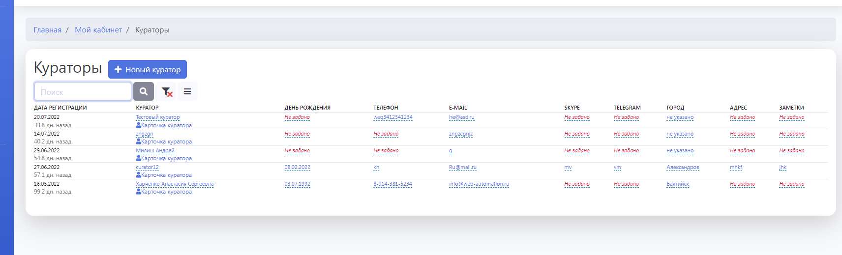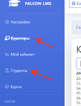 В основном меню есть ссылки на страницы управления кураторами и студентами: